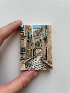 Attention to detail has always been a constant—a deeply rooted instinct etched in memory. Since 2016, this precision has found its natural expression in painting, particularly in the creation of miniature canvases. Landscapes, portraits, seascapes, architecture, commissioned pieces—whatever the subject, each work takes shape in a workshop where the process unfolds just a few centimeters from the canvas. No magnifying lenses are used—only patience, precision, a pair of blue glasses, and an expert hand.