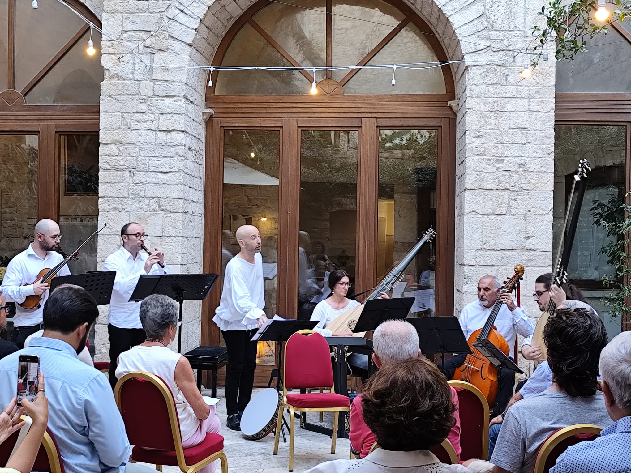 Grazie ai manoscritti del compositore giovinazzese Beniamino Andriani, figura poliedrica e brillante della storia musicale locale, è stato possibile riportare alla luce canti popolari inediti in dialetto giovinazzese. Il lavoro del M° Stefano Stabile, con arrangiamenti storicamente ispirati e fedeli alla prassi esecutiva del Seicento, ha permesso di intrecciare la tradizione popolare con le sonorità raffinate della musica barocca. Liuto, viola da gamba, flauto dolce e voce hanno dato vita a un intreccio armonico di grande suggestione, capace di emozionare il pubblico e trasportarlo in un’atmosfera senza tempo.